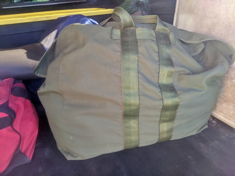 Or you can spend ~$30, get something from eBay surplus stores, and get another 90-liter duffle that’s durable, swallows your gear, and easier to pack: The Flyers Kit (parachute) bag.
