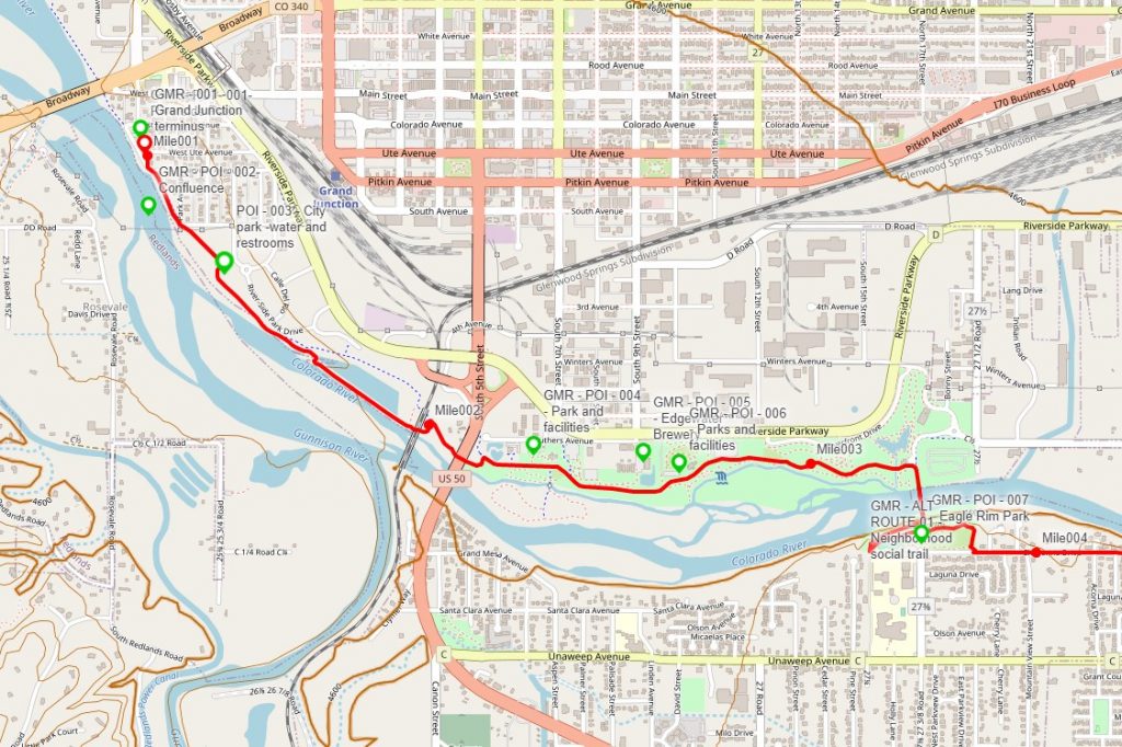 - The Grand Junction terminus starts at Riverside Park and along the Riverfront Trail and is located 8 miles from the airport. Lyft/Uber makes it easy to get to and from this point. A more prominent regional hub with many grocery stores, lodging options, and even an REI (among other outdoor stores). Google is your friend for GJ!