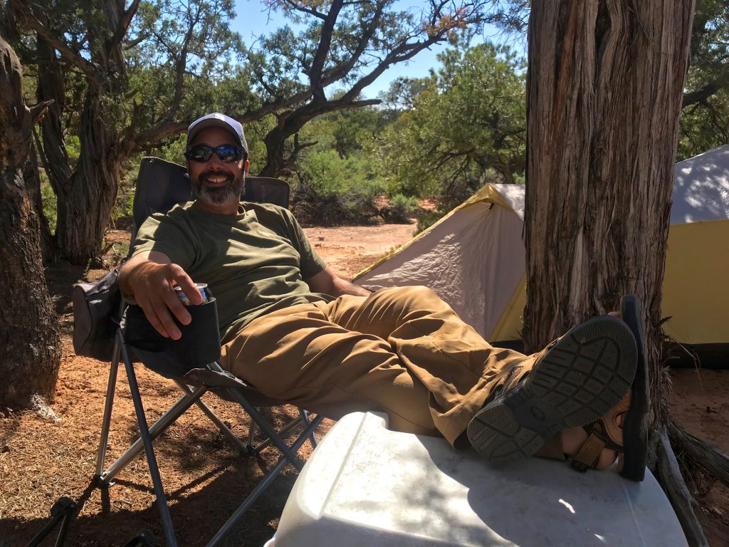 In Navajo National Monument, enjoying some post-hiking relaxing with the Wrangler Pants.