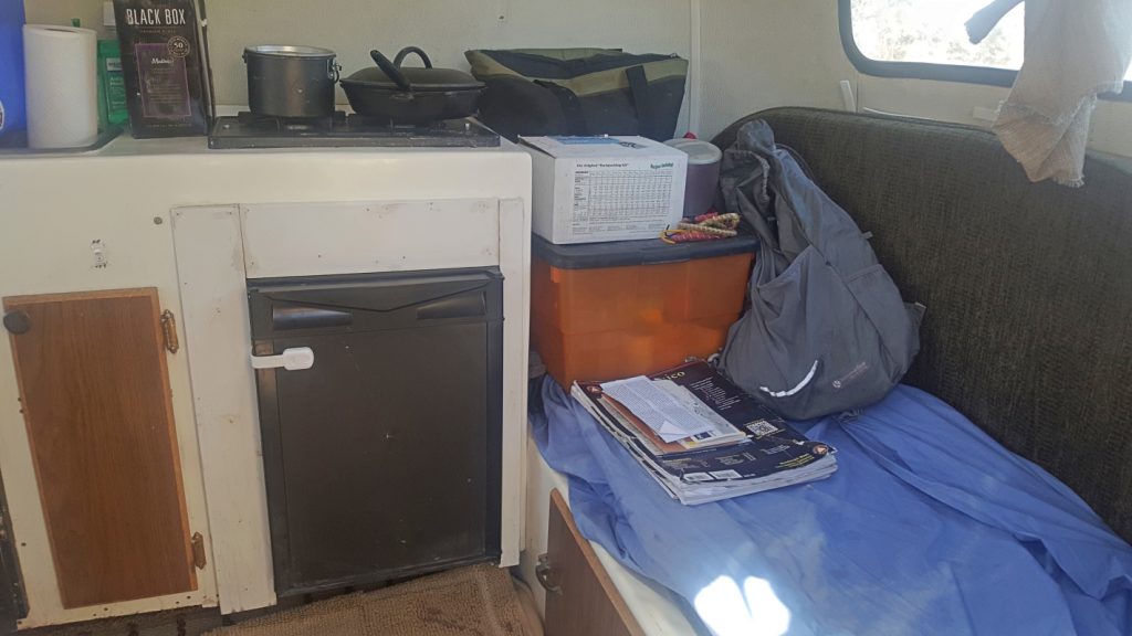 The cubby hole formed by one end of the couch and the stove/fridge is my “pantry.” The orange tote contains canned goods. The soft-sided bag has oatmeal, nuts, dried fruit, powdered milk, quinoa, and similar. I usually have a sheet on the upper cushion to keep it clean. I moved it to show the cushion.