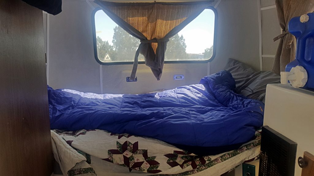 Since I am solo, I always keep the table in bed mode. I have been using an older winter sleeping bag as a quilt. Though the sheets and bedspread do class up the place. 🙂