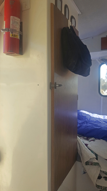 Just at the Scamp door is another closet. In there I keep dirty laundry, cleaning supplies, laundry detergent, an extension cord, and where I suspect a small propane heater will be placed there in the future for storage.