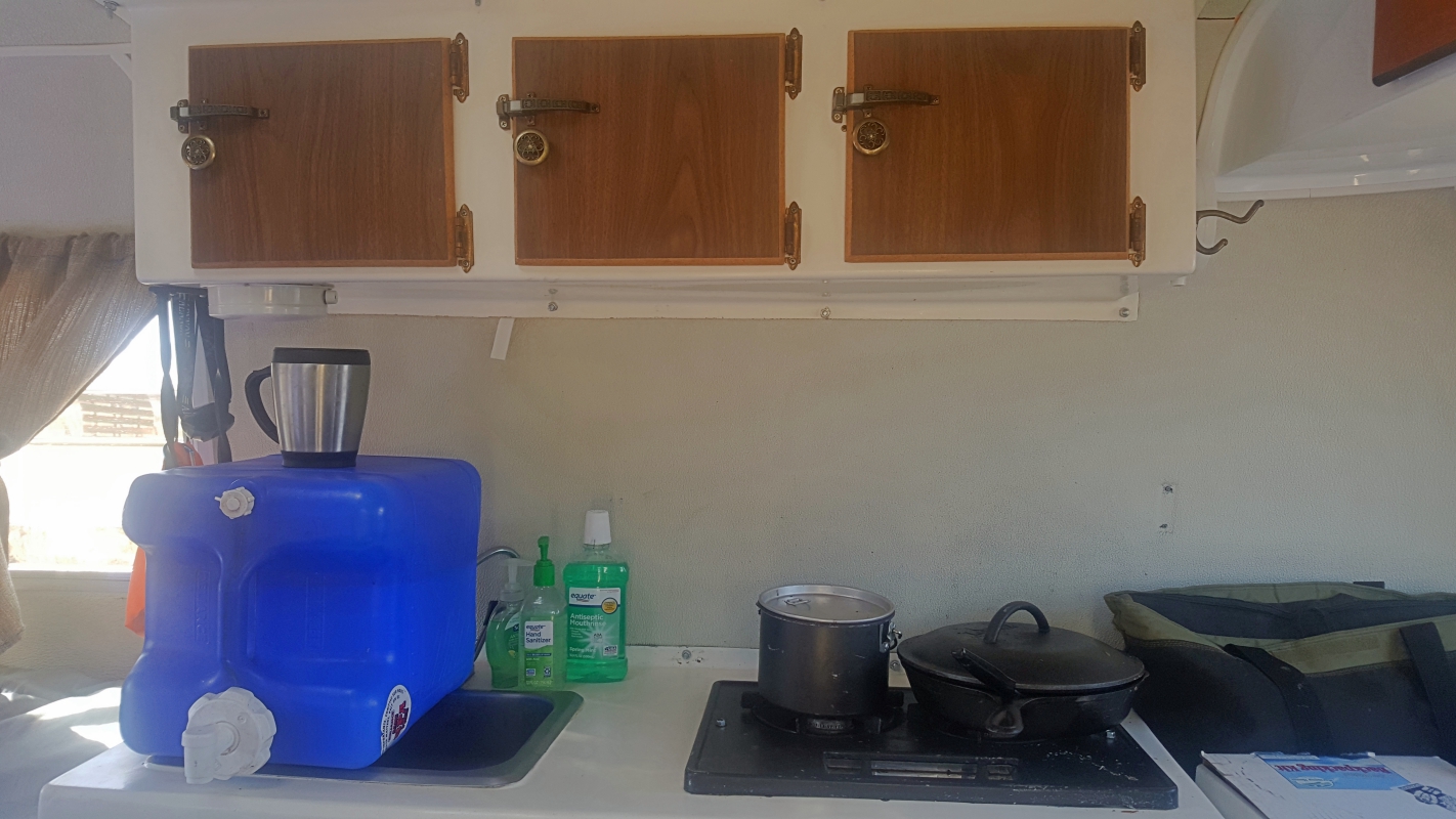 Above is a view of the sink, the water jug, stove, and cabinets. I keep olive oil, spice, coffee, tea, hot chocolate, and similar up there.
