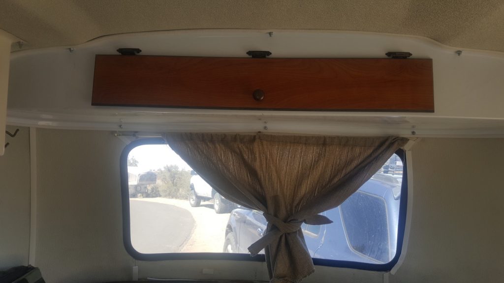Above the bed is also an identical storage bin to the one above the couch. I keep my “go to” camp clothes such as my puffy, fleece hat, fleece pullover, rain gear, wind pants, etc. I also keep my toiletries while traveling and some electronics (see below).