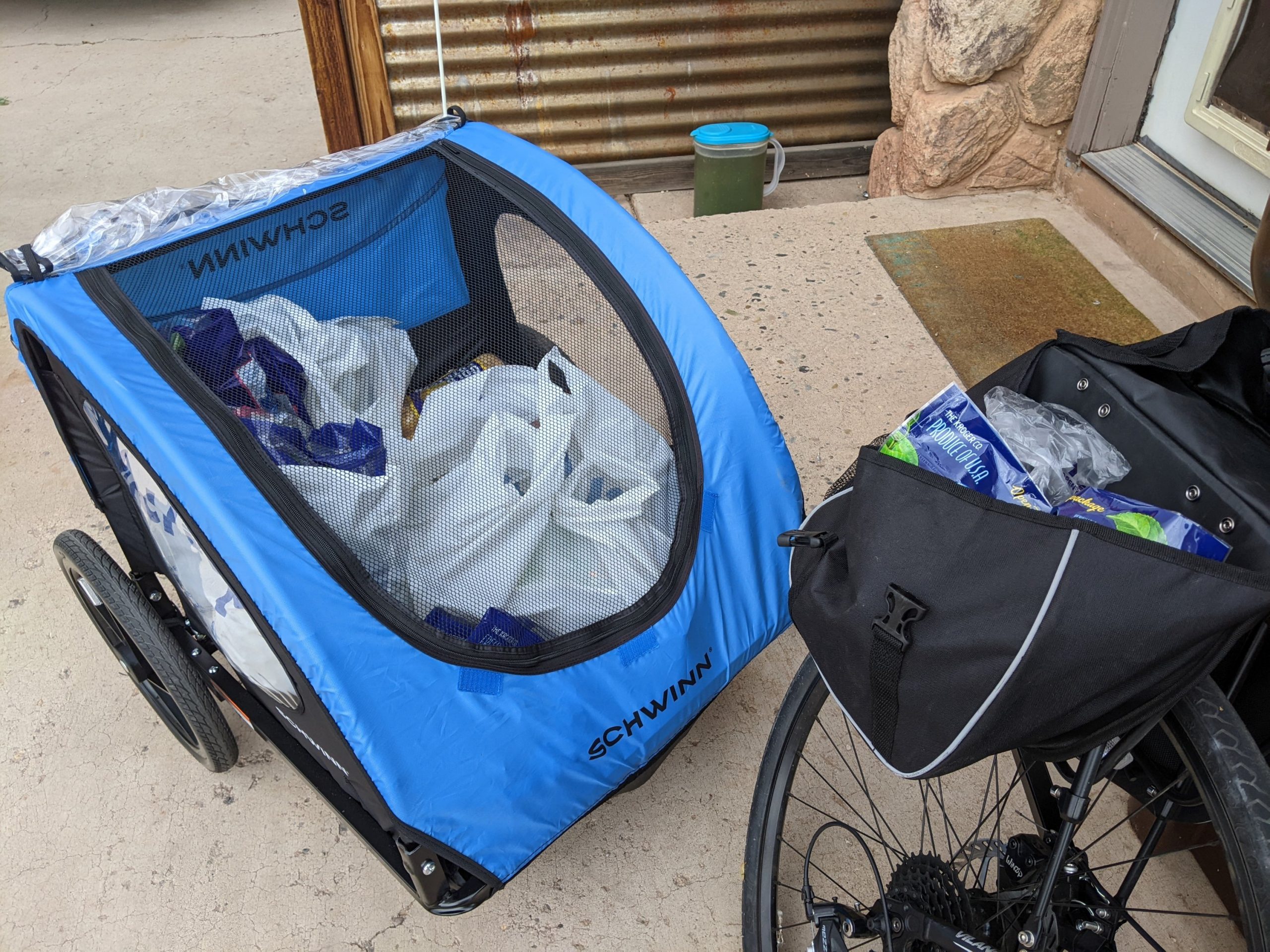 So with Joan working this past Sunday, I put together a simple bike trailer meant for children but works well for getting groceries for two.