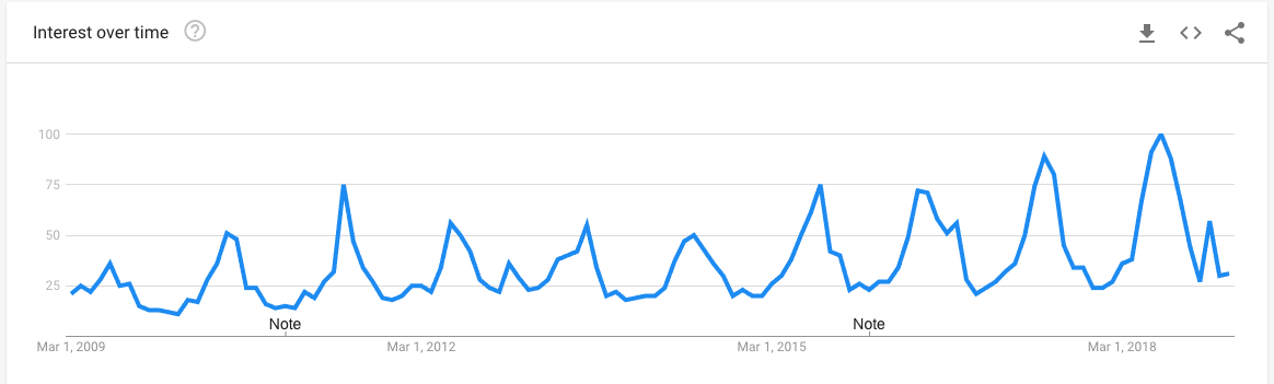 But longitudinal Google search trends show steady growth in interest in bear spray over the years. Not the only evidence that could be procured such as sales, and it does not factor in the overall growth of an online presence, but interesting overall.