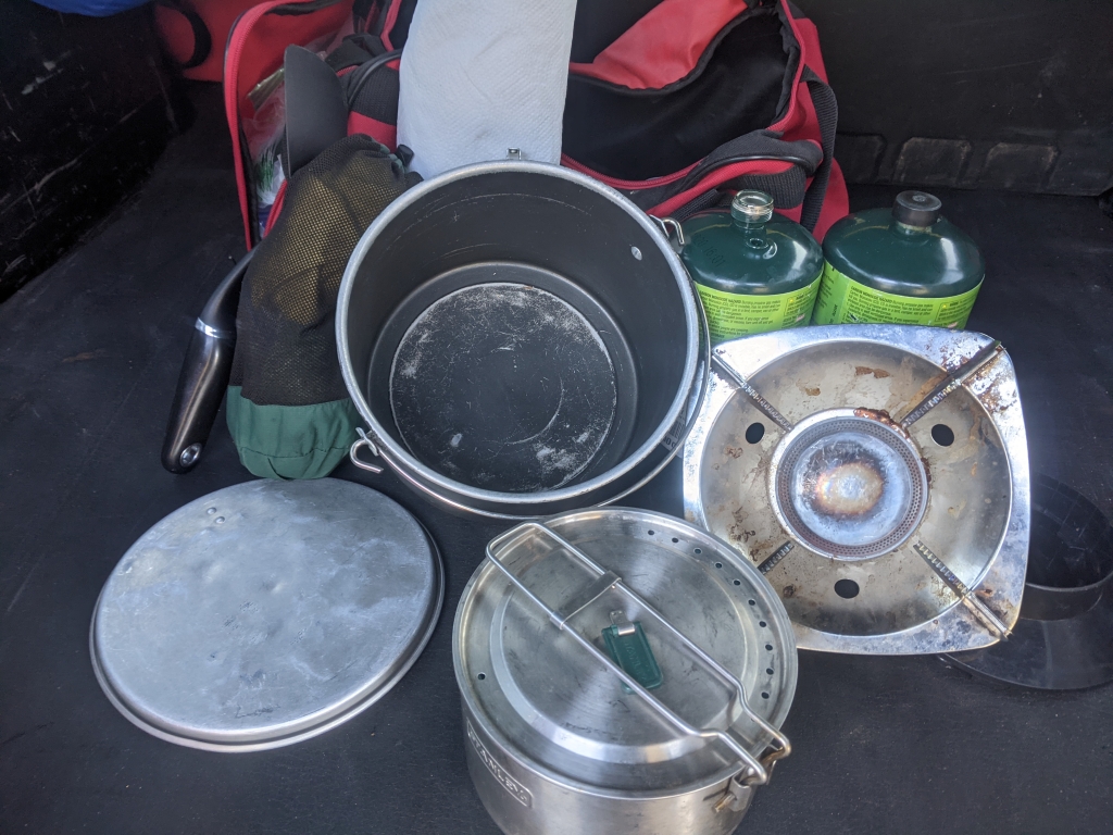 Finally, we take the appropriate water jug and cooler. We always have a pre-packed “pantry tote” with canned goods, dried food, olive oil, and drink mixes. I pack everything neatly and well organized, so everything is easily grabbed and laid out in a manner that allows ease of access. If we want to brew up a post-hike hot drink, for example, the small cook kit, hot chocolate mix, and water are all within easy reach and stage easily on the tailgate. Perfect for a post-hike hot drink before the drive home. We always re-pack the pantry tote after each trip and just grab it when we are ready to go on another weekend of fun.