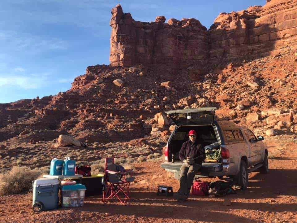- Continuing our homey theme, Joan and I met a person in Horseshoe Canyon who had a kitchen mat that fits just over the tailgate (get a large size or cut one down). Joan immediately wanted one for sitting on, leaning on when lounging out in the morning or the evening, and making an area to place things on. Combined with our scraps of foam pads that serve many different purposes (sit pad, changing pad for shoes, insulation on the side of the wheel well when sleeping, etc.), the liftgate makes a suitable place to sit. During more temperate weather, we use the camp chairs stored in the back of the truck. And the tailgate doubles as a table/cooking area. The “Live, Laugh, Love” mat ends up as delightfully cheesy, homey, and good advice for anyone. Joan provided the link if you want the specific version of this tchotchke for your tailgate (the 18″x55″ mat overlaps slightly).