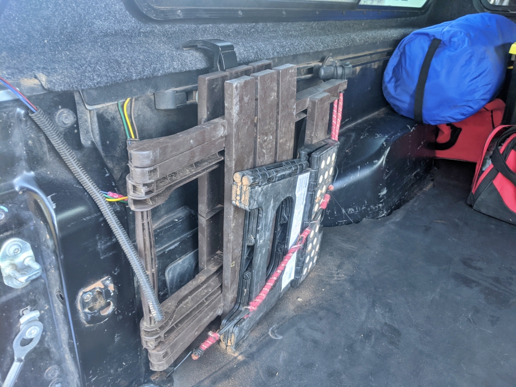 With the camper shell, here’s the rest of our system. There are many, many, many articles online on turning a camper shell into a mini-RV. But I wanted to keep it simple, still have access to the truck bed, and recognize that we use the truck to sleep and not live in it. We also tend to camp in out of the way places and do not need as much stealth. As I learned with the Kia, having underneath storage works well but complicated things, too. More so in a truck where I can’t open side doors to access the back part of the cargo shelf system without drawers.