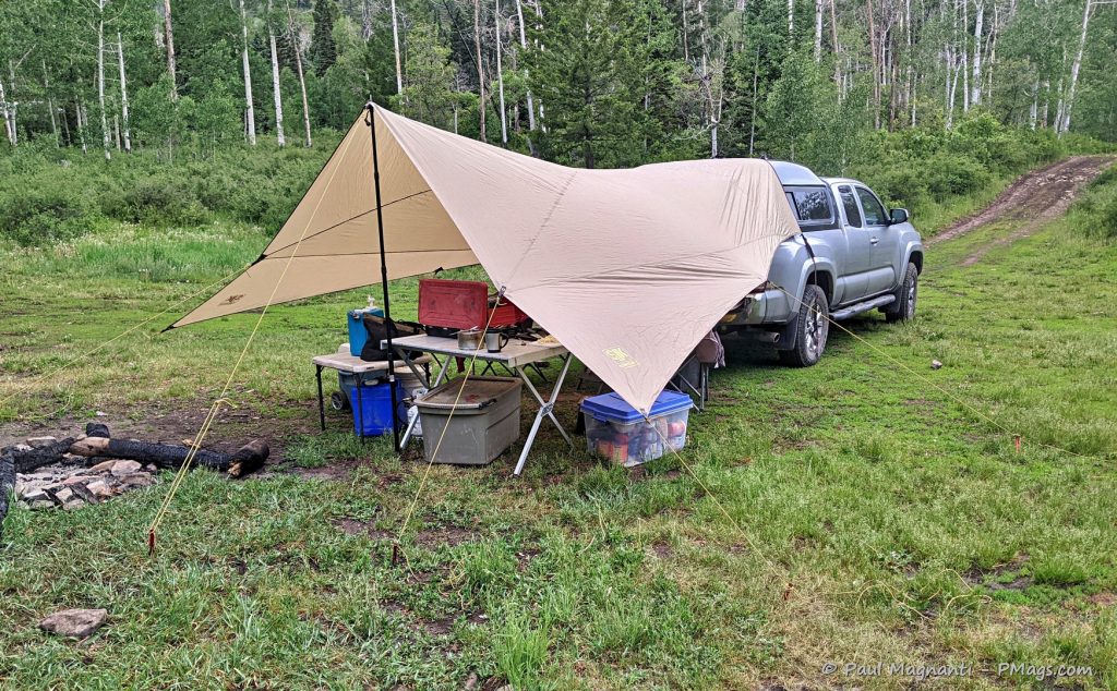 - Speaking of rainy, we purchased the amazing Slumberjack Roadhouse Tarp for $120. It is essentially a tarp made for SUVs and trucks with camper shells; it sets up quickly, extremely versatile, and weather resistant. We used it a few times during the summer rains in the mountains before we received our shell. Otherwise, I’d have some photos. It provides a great place to cook, hang out, and get out of the sun or rain. Joan and I both marveled at how much thought someone put into the design and how compact it is overall when packed up. Highly recommend it. If you factor in the cost of a similar quality tarp, stakes, poles, and guylines, the overall cost is reasonable, in my opinion. Update February 2021 – Read more about it here