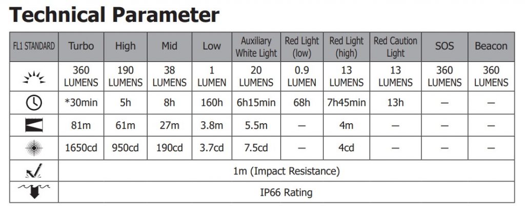 • 360 max output lumens with four different white light settings of a low, medium, bright, and turbo mode; bright enough for general use and then some! As with almost all headlamps, the NU25 also features an emergency strobe light mode, among other settings.