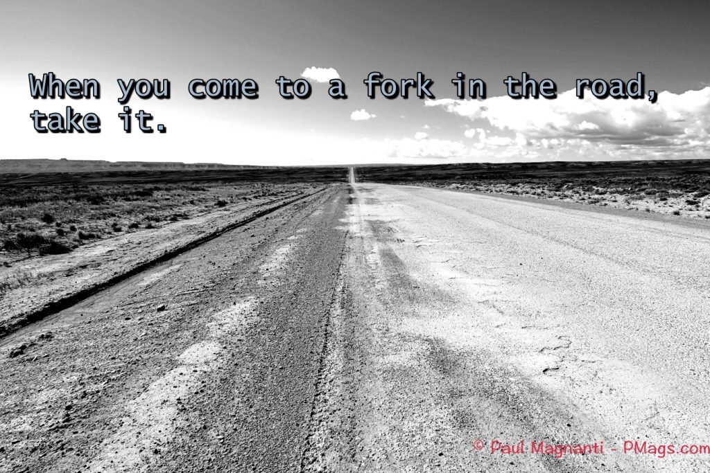 Of course, I have to start with one of the two most famous Yogi quotes. When I follow the usual path, I tend to find life is lacking a certain vitality. When I did take the fork in the road? Well, I moved to Colorado, walked for many weeks or months at a time, traveled across the country, and ended up in Moab.